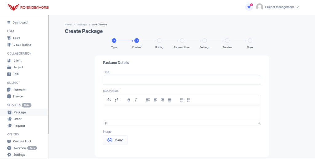 Ro CRM enables you to list your services just like products, clearly defining the deliverables, timelines, and pricing for each service. You can create detailed service packages that convert directly into projects.